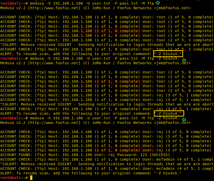 medusa -h 192.168.1.108 -u raj -P pass.txt -M ftp -e ns