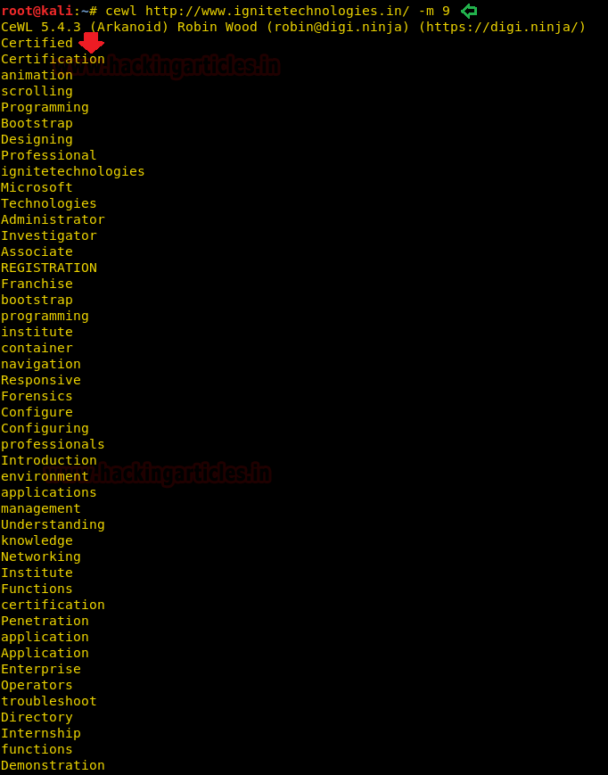 cewl http://www.ignitetechnologies.in/ -m 9