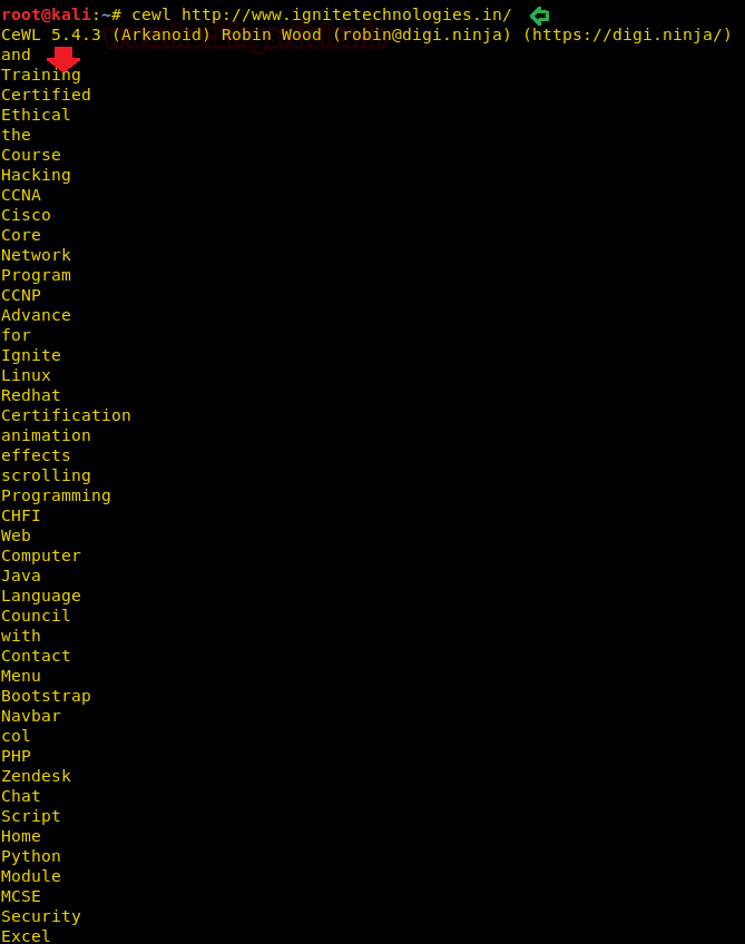 cewl http://www.ignitetechnologies.in/ -w dict.txt