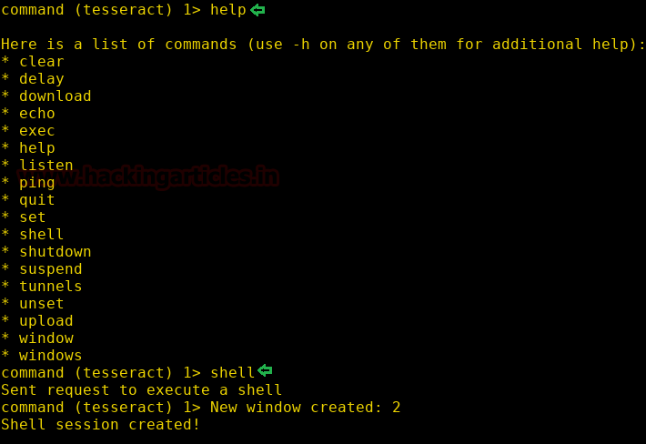 Further will the help command you can see all the options that we can use to our advantage. If you want to go to the shell then just type ‘shell’ and it will open a new window with the session to interact with the shell of the target system.