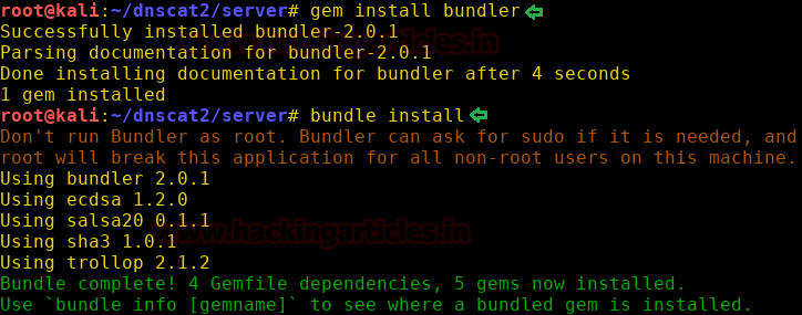Now install bundler as it is a major dependency for dnscat2. To install bundler go into the server of dnscat2 and type :