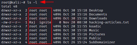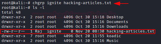 Let’s change the owner of hacking-artciles.txt from root to Raj