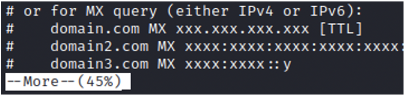 less /etc/ettercap/etter.dns