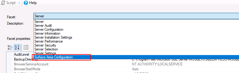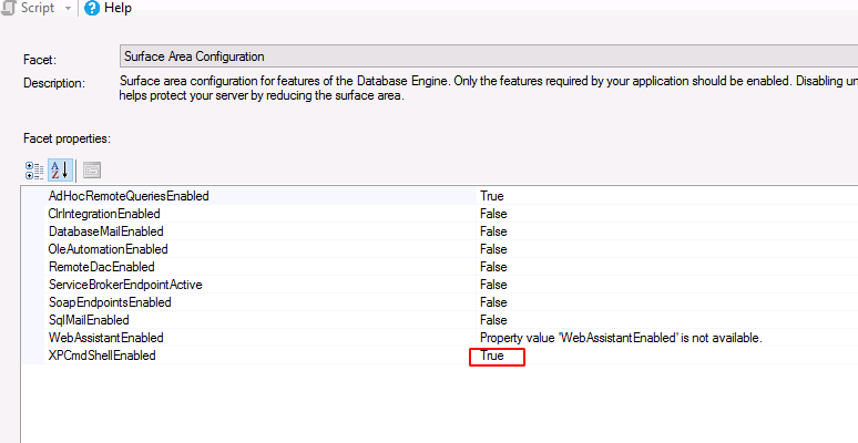 After choosing the surface area configuration facet. We can see that we have the XPCmdShellEnabled option set as false.