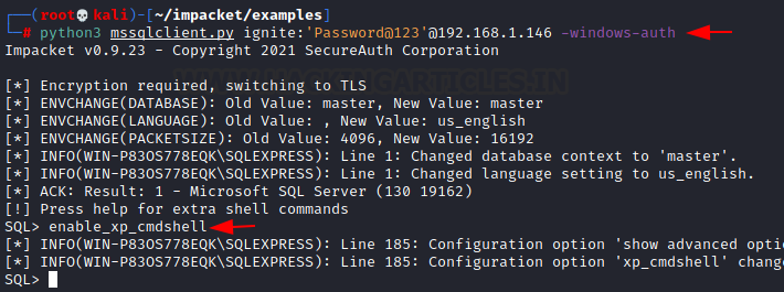 Moving on to the next tool that we can use with this kind of activity is the mssqlclient.py Python script that is part of the Impact toolkit. To use mssqlclient.py, we will need to specify the username, domain, password, the target IP address, and the Port that is hosting the Ms SQL service as shown in the image. We can see that first a connection is established then it is switched to the TLS negotiation Followed by the packet size that is changed from 4096 to 16192. Then we can see that the impact was able to get the SQL Express command shell, where it changes the database context to master and the language setting to US_English. Here we can get a banner that says that we can run the help command to get the extra shell commands. Then we can use the command enable_xp_cmdshell to enable the XP command shell functionality on the target machine.