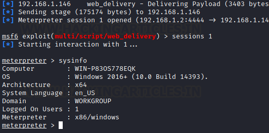 Now to get this particular payload downloaded and run on the target machine. We will take the help of the crackmapexac tool with Ms SQL protocol running with the IP address of the target machine with the username Ignite. And the password for that particular user also, stating the payload method as web_delivery with the URL that the web_delivery payload generated as shown in the image below. After running the crackmapexac would show that the target has been pawned.