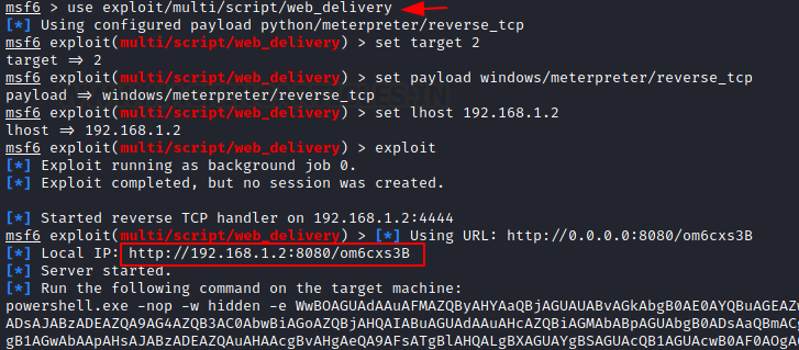 Another method to get a reverse connection on the target machine from the Ms SQL XP command Shell functionality is by using its ability to run system commands associated with the web_delivery payload. The process is quite simple, we just use the exploit/multi/script/web_delivery exploit, set the target as the Windows machine then set the payload as windows/meterpeter/reverse_tcp. then set the local host to the IP address of the kali machine. Finally, we will run the exploit command. This would create a payload and host that particular payload on a port that in our case is 8080.
