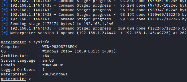 When the crackmapexec shows that the target has been pawned, we can go back to the Metasploit shell and find that the target has been exploited successfully and we have a meterpreter shell on the target machine.
