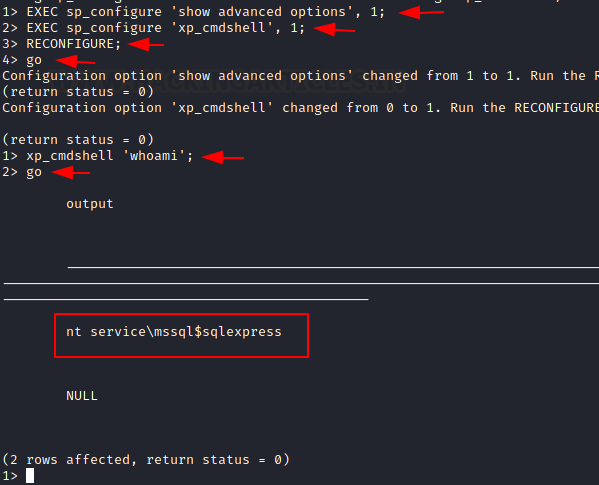 Again, we can verify it in a similar way that we did with the GUI approach and the sqsh approach. Here we can see that we were able to enable the XP command shell functionality with the help of mssqlclient which is a part of the Impact toolkit.