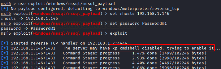 Metasploit can also be helpful if we want to enable the XP command shell functionality. For this, we will have to use the exploit/windows/mssql/mssql_payload Exploit. This exploit requires a couple of options, such as setting the rhost which contains the IP address of the target machine, the password to access that particular machine. To approach the target machine and run particular commands on it, it first enables the XP command shell functionality on the target machine.