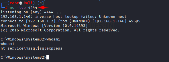 We will, however, create a netcat listener on the Kali machine before running the previous command of generating a reverse connection. This listener well captured the shell as soon as the command is executed and, a session is generated. Here we can see that upon running the whoami command on the shell, we find that the shell that we have is for the NT service\mssql$sqlexpress user.