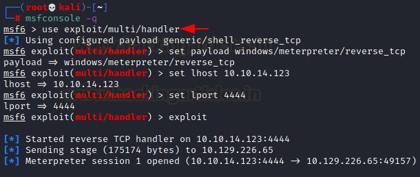 On the other hand, we are starting msfconsole, selecting multi handler module with reverse shell payload, and running the exploit.