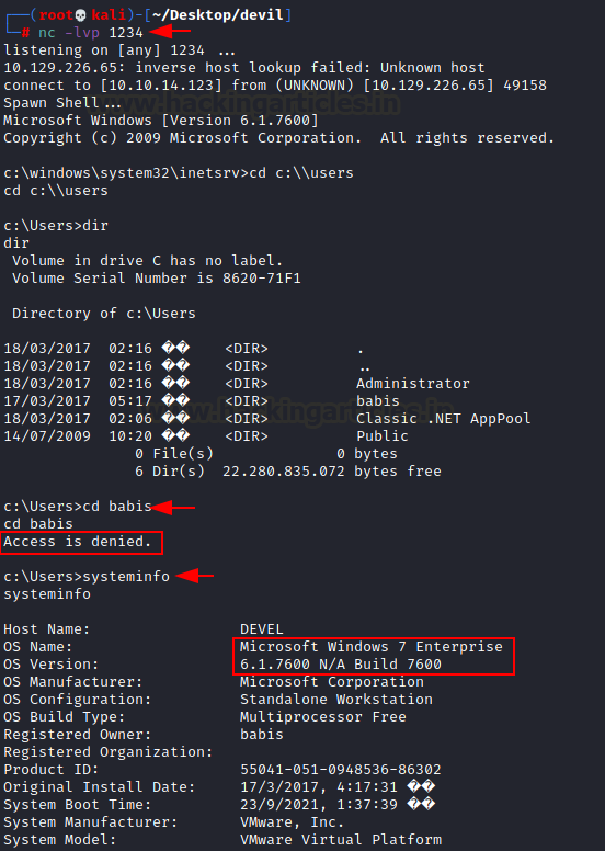 Boooom!!! We will get the netcat session. Do the post enumeration to fetch the flag file .But unfortunately access is denied on babis and administrator directory.