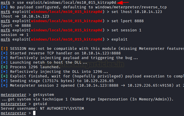 Great!!! We have a meterpreter session again and through getuid, we get to know that we have a system-level shell.