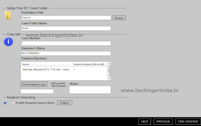 Click on browseto select the destination folder. Assign the case Name, case no. & Examiner’s name.Click on find evidence.