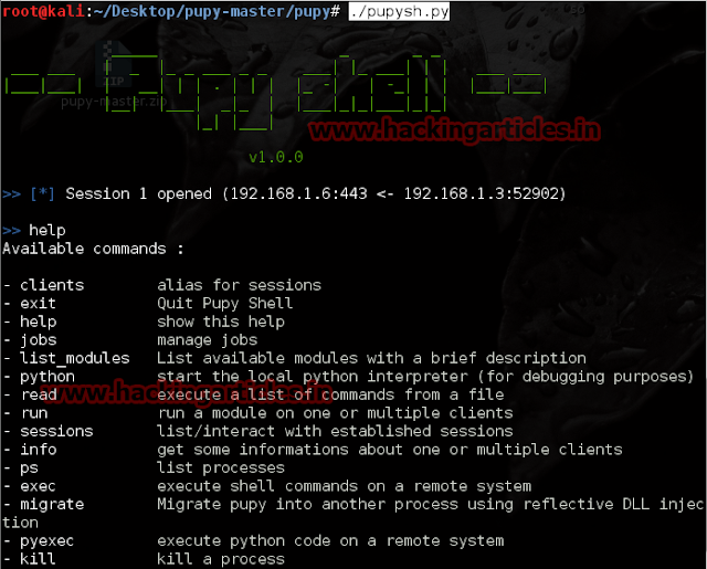 Now open pupy Shell. It will show the message session 1 opened.