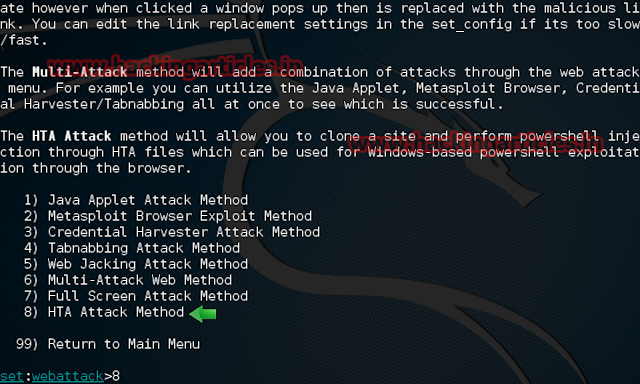 Now choose option 8, “HTA Attack Method”