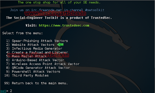 Now choose option 2, “Website Attack Vectors”