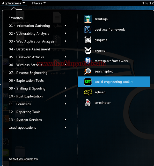 First open your kali Linux application tab in Exploitation Tools and then chose SET Toolkit