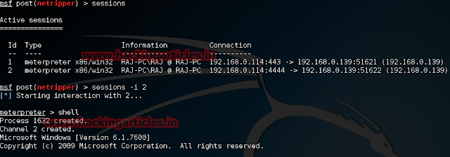 You have access to the victims PC. Use “Sessions” and the Session number to connect to the session. And Now Type “sessions –id ID“and type shell to get command prompt of victim pc.