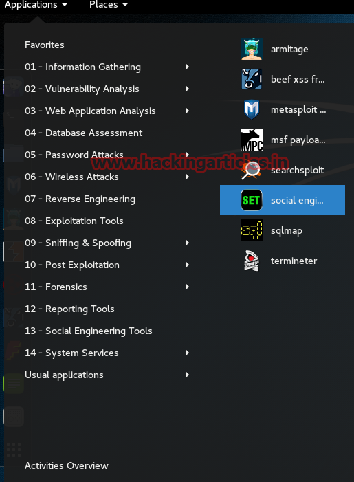 First open your kali Linux application tab in Exploitation Tools and then chose SET Toolkit