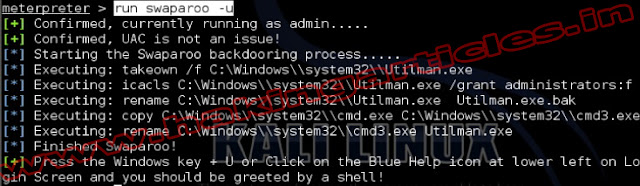After getting the Meterpreter session type run Swaparoo to replace sethc.exe with command prompt