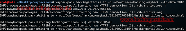 In example below I'm using hackingarticles.infor the year 2010 and saving the result in /Downloads/hacking-wayback