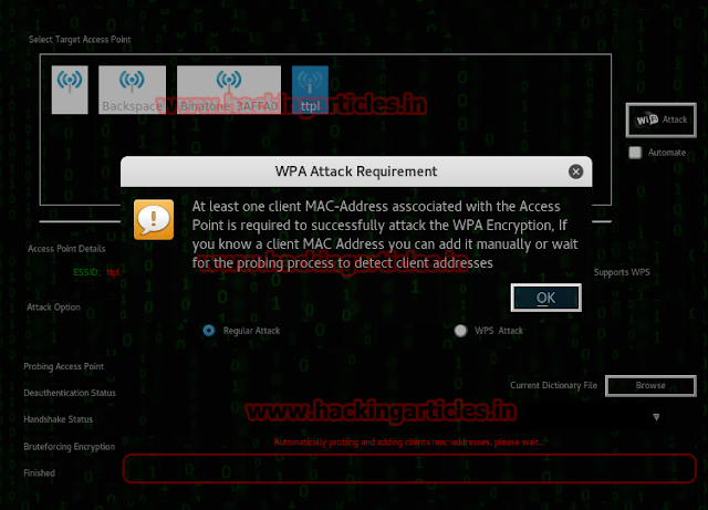 Now it will prompt with WPA ATTACK REQUIREMENTas at least 1 client is required to be connected to the target AP, so click OK on it.