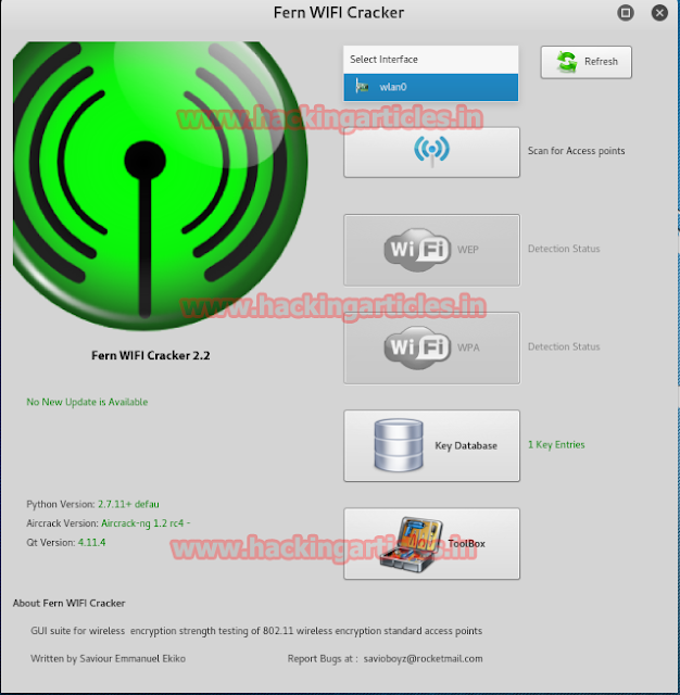 Fern Wifi Cracker is a Wireless security auditing and attack software program written using the Python Programming Language and the Python Qt GUI library, the program is able to crack and recover WEP/WPA/WPS keys and also run other network based attacks on wireless or ethernet based networks.