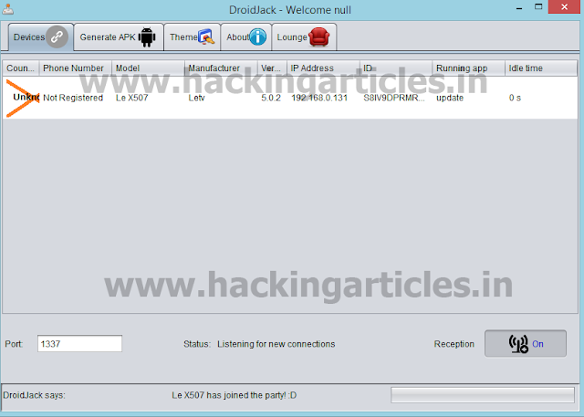 So now go to Devices and set the port field in the lower left corner to the same port with which you have generated the APK as in my case it is 1337 and then click on Reception to start the listening mode.