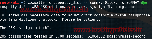 Now it will generate a dictionary file named cowpatty_dictwhich will speed up the cracking process.
