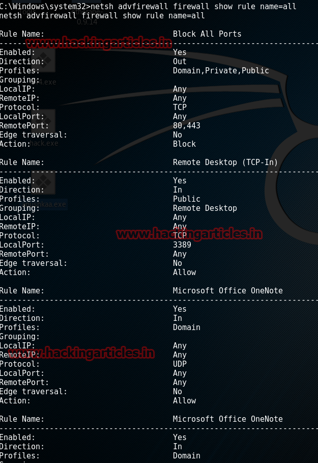 To know which rule is enabled and disabled in our remote PC , take a session through meterepreter and bypass administrator privileges. After doing so type: