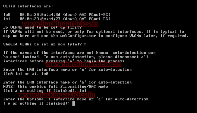 Now it will ask you to name WAN and LAN interface. Give le0 name to WAN and le1 to LAN. Then just hit enter when it asks you to name optional interface.