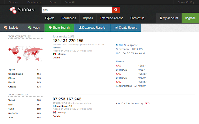 Shodan even lets you find all the GPS devices all over the world and for this you just have to type gps in the search box.