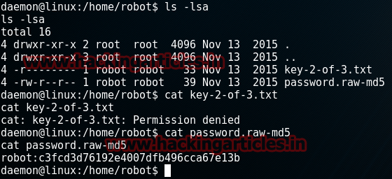 Following the command it will ask you for the password. Enter the MD5 cracked password here and you will enter the robot user and to gain its information type :
