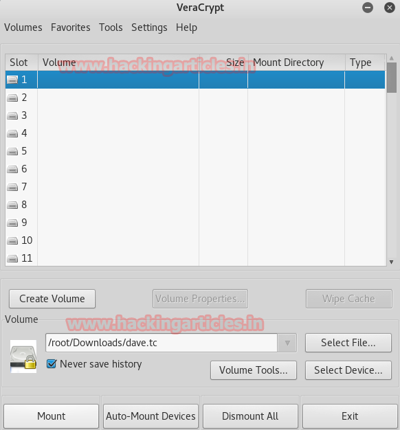 Using the above command you will have you password in minutes. Now that we have our password, we will try and mount the drive from VeraCrypt again. Follow the same procedure as earlier and then add the password and check the true crypt mode.