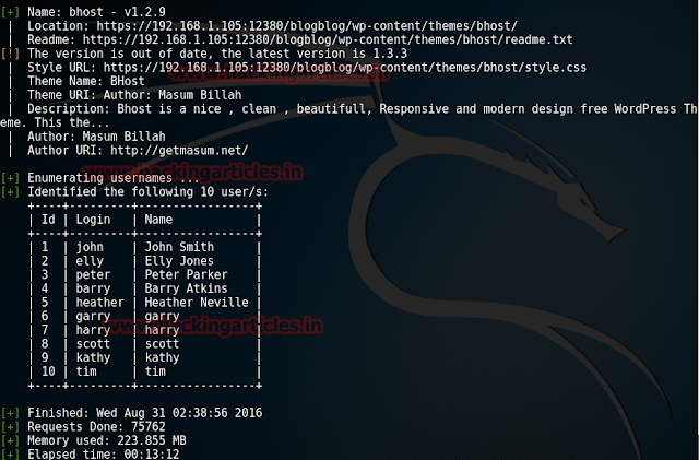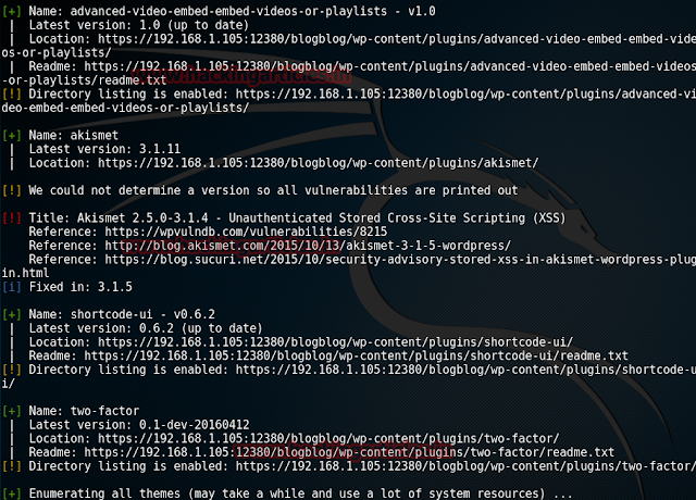 Studying this blog we have established that the blog is made off Word Press. Now obviously use WPScan to know all about the blog. To apply wpscan we have come up with a 3-in-1 command as it will tell us all about the theme and plug-ins as well as usernames and the command is: