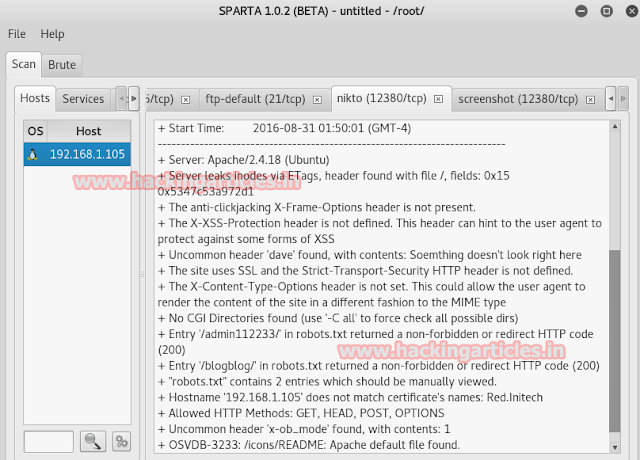 Result shows us that port number 21, 22, 53, 80, 137, 139, 666, 3306, 12380 are open. The Nikto tab in Sparta of port number 80 shows us that we can open our target IP in browser also it provides us with the information that /.bashrc and /.profile are the files which may contain useful information.
